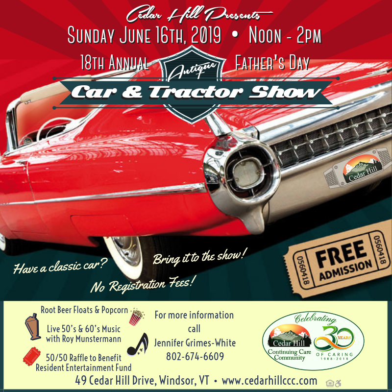 This is one of Cedar Hill’s major events of the year at our Windsor assisted living center where our residents, families and the public love mingling with the cars and tractors and their drivers on our beautiful senior living campus. Come enjoy.